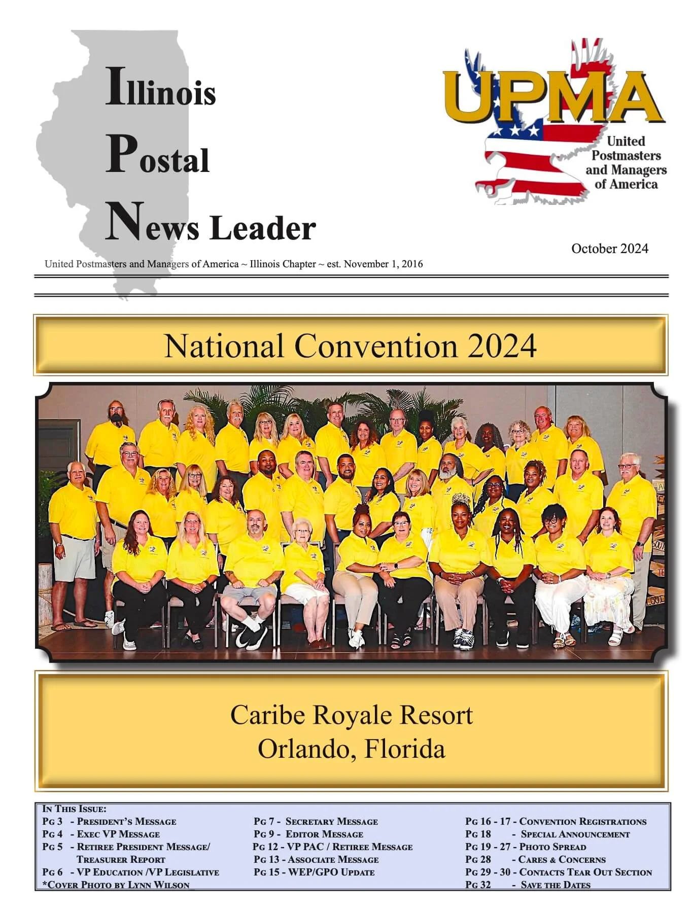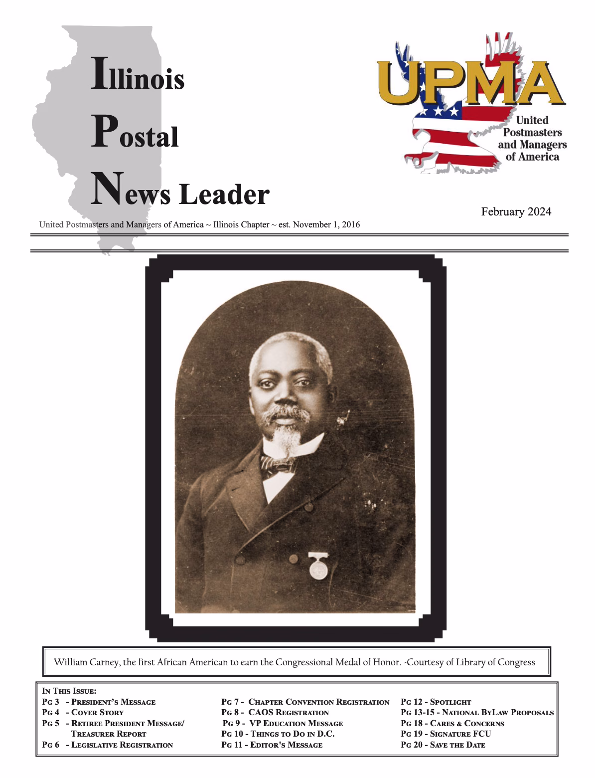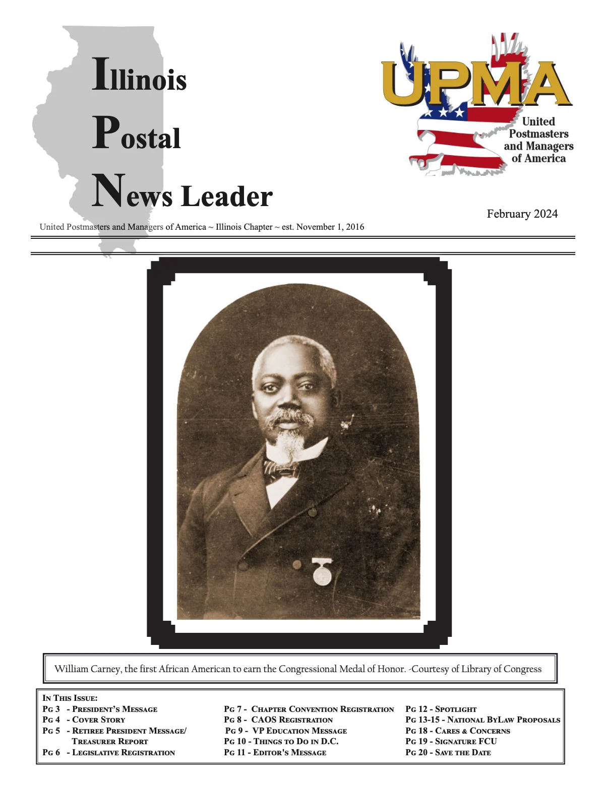 In the January 2022 issue of The Illinois Post News Leader : • 2022 UPMA EVENTS • LEGISLATIVE SUMMIT • CENTRAL AREA OFFICERS TRAINING • STATE CONVENTION • NATIONAL CONVENTION • SOUTHERN OFFICERS CONVENTION A NEW YEAR FILLED WITH NEW ADVENTURES!